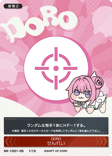 | NK-1001-06 DORO:せんれい | AR | 射程2 | ランダムな相手1体にHP-1する。 ※補足 相手ニケのステータスカードを利用してランダムに1体を指定して下さい。 |