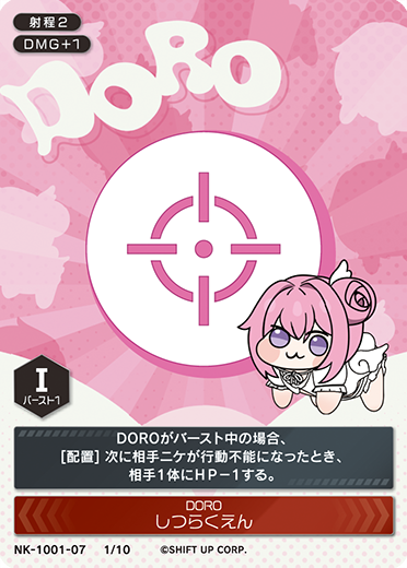 [バースト : Ⅰ] DOROがバースト中の場合、 [配置] 次に相手ニケが行動不能になったとき、相手1体にHP-1する。 |