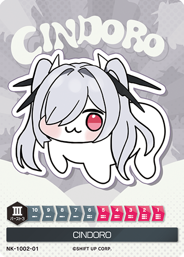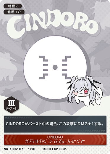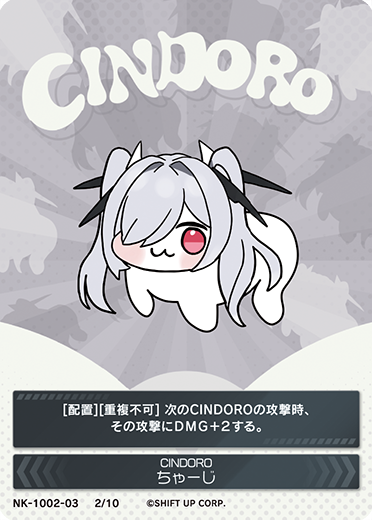 | NK-1002-03 CINDORO:ちゃーじ | RL | [配置][重複不可] 次のCINDOROの攻撃時、その攻撃にDMG+2する。 | 2/10 |
