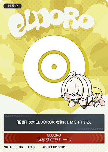 | NK-1003-06 ELDORO:ふぁすとちゃーじ | MG | 射程2 | [配置] 次のELDOROの攻撃にDMG+1する。 | 1/10 |