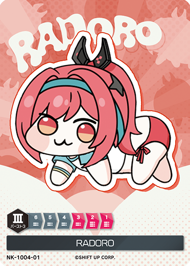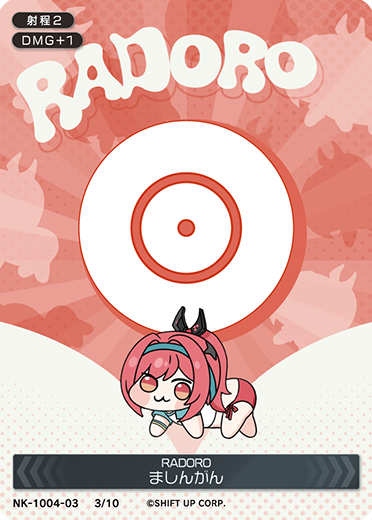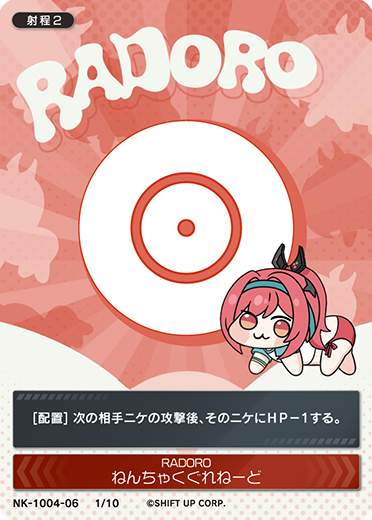 | NK-1004-06 RADORO:ねんちゃくぐれねーど | MG | 射程2 | [配置] 次の相手ニケの攻撃後、そのニケにHP-1する。 | 1/10 |