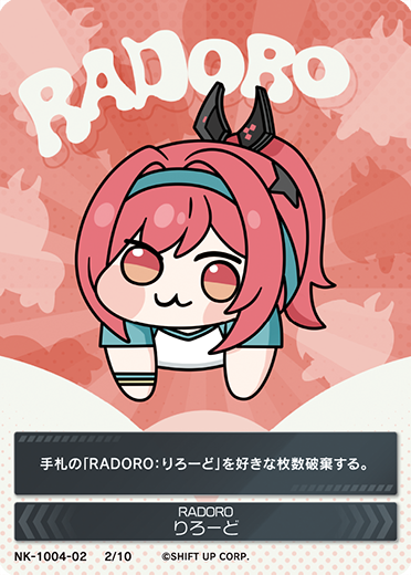 | NK-1004-02 RADORO:りろーど | MG | 手札の「RADORO:りろーど」を好きな枚数破棄する。 | 2/10 |