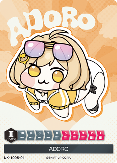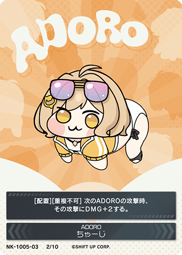 | NK-1005-03 ADORO:ちゃーじ | RL | [配置][重複不可] 次のADOROの攻撃時、その攻撃にDMG+2する。 | 2/10 |