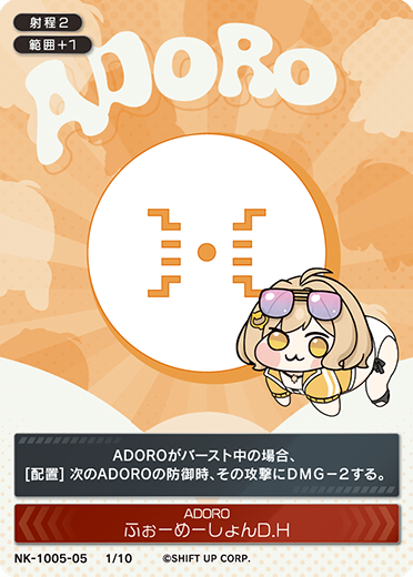 ADOROがバースト中の場合、 [配置] 次のADOROの防御時、その攻撃にDMG-2する。 |
