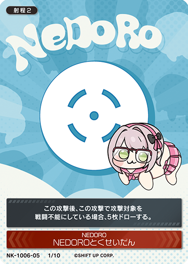 | NK-1006-05 NEDORO:NEDOROとくせいだん | SG | 射程2 | この攻撃後、この攻撃で攻撃対象を戦闘不能にしている場合、5枚ドローする。 | 1/10 |